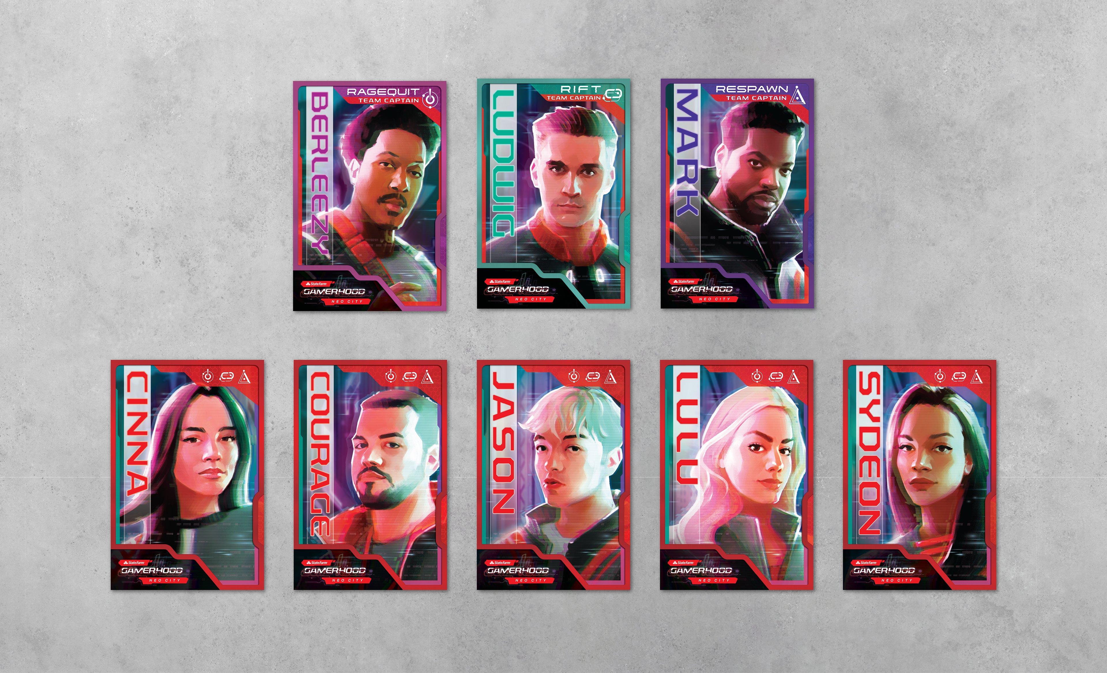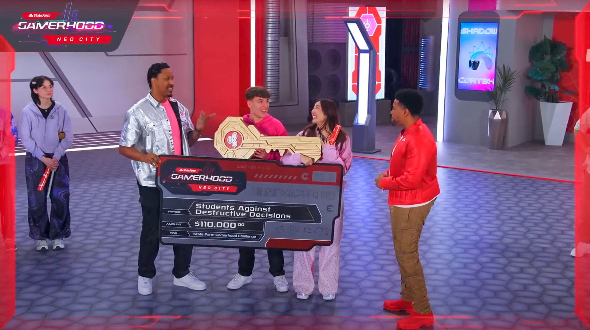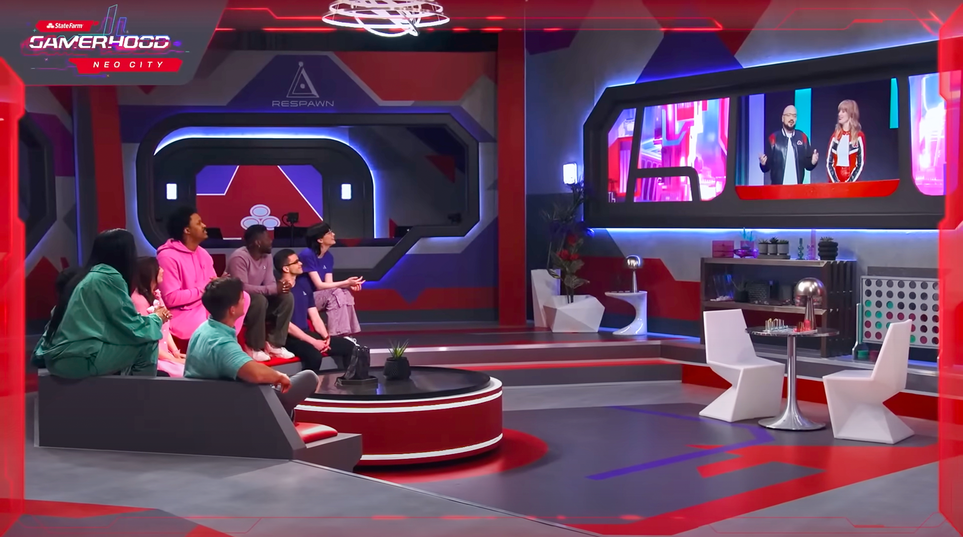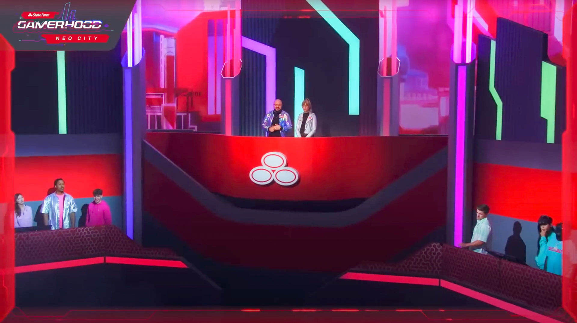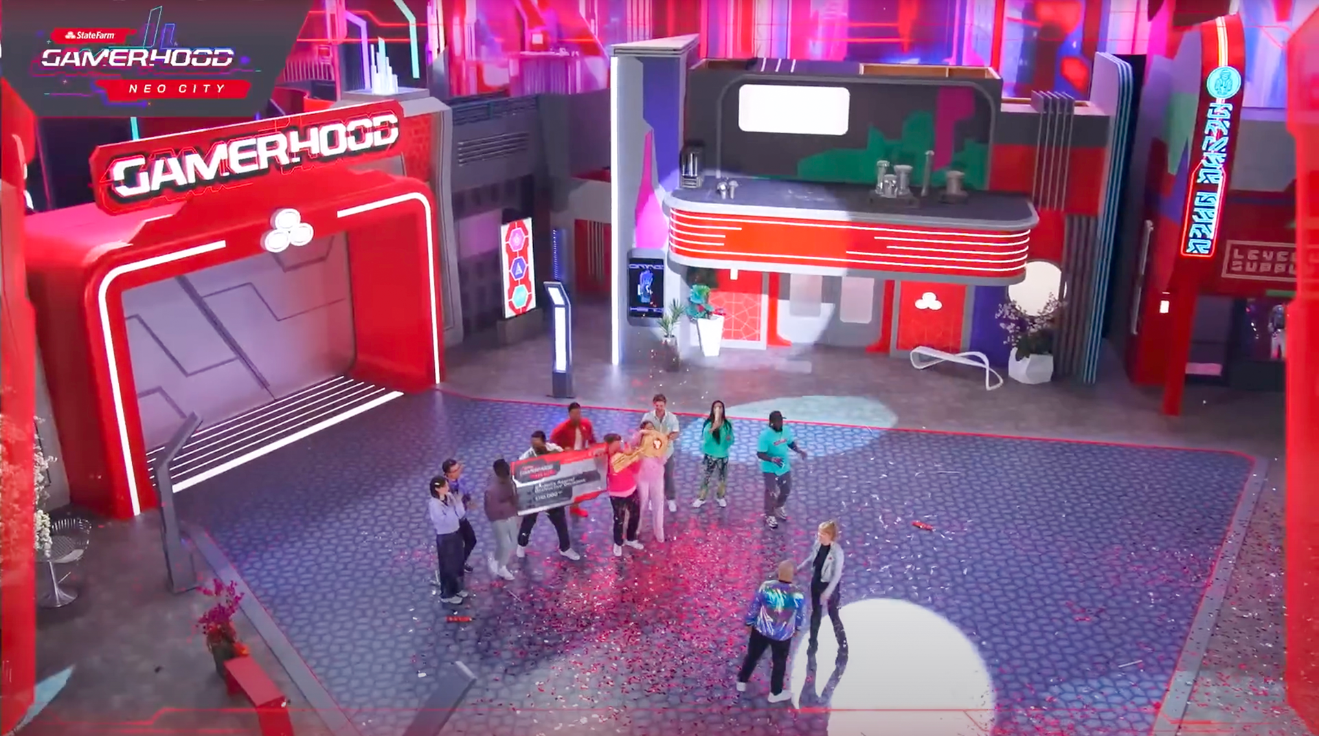 A game show produced by Infinity Marketing Agency for State Farm Insurance for audiences on Twitch and YouTube. Gamers, influencers and celebrities entered the Neo City, a futuristic, cyberpunk gaming arena to compete to win the key to the city and a check for a non-profit of their choice. Every wall and surface was skinned with graphics and digitally created textures.